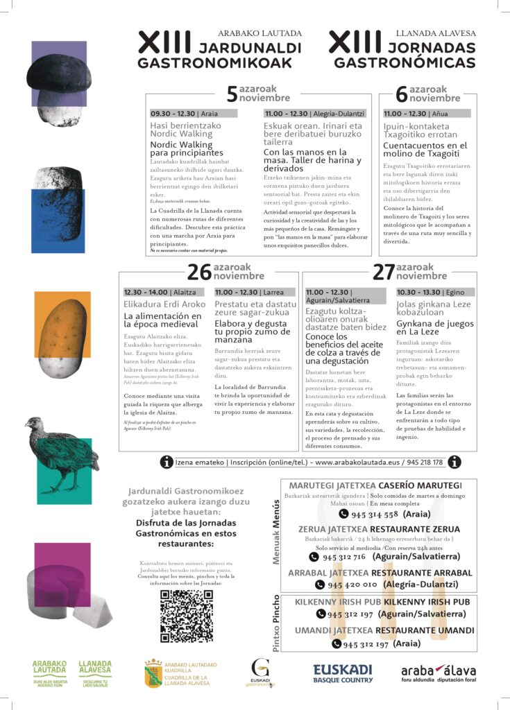 Arabako Lautadan dugun zita heldu da beste urte batez. Azaroan, Arabako Lautadako Kuadrillak zapore berezia izango du, bertako janaritegiko zaporea, eta zure zain dago. XIII. Gastronomia Jardunaldiko protagonistak patatak, ehiza, gazta, ogia eta onddoak dira. Kalitate goreneko produktu osasungarri eta bikainak izango ditugu, tokiko ekoizleen lan ona bermatzen dutenak.