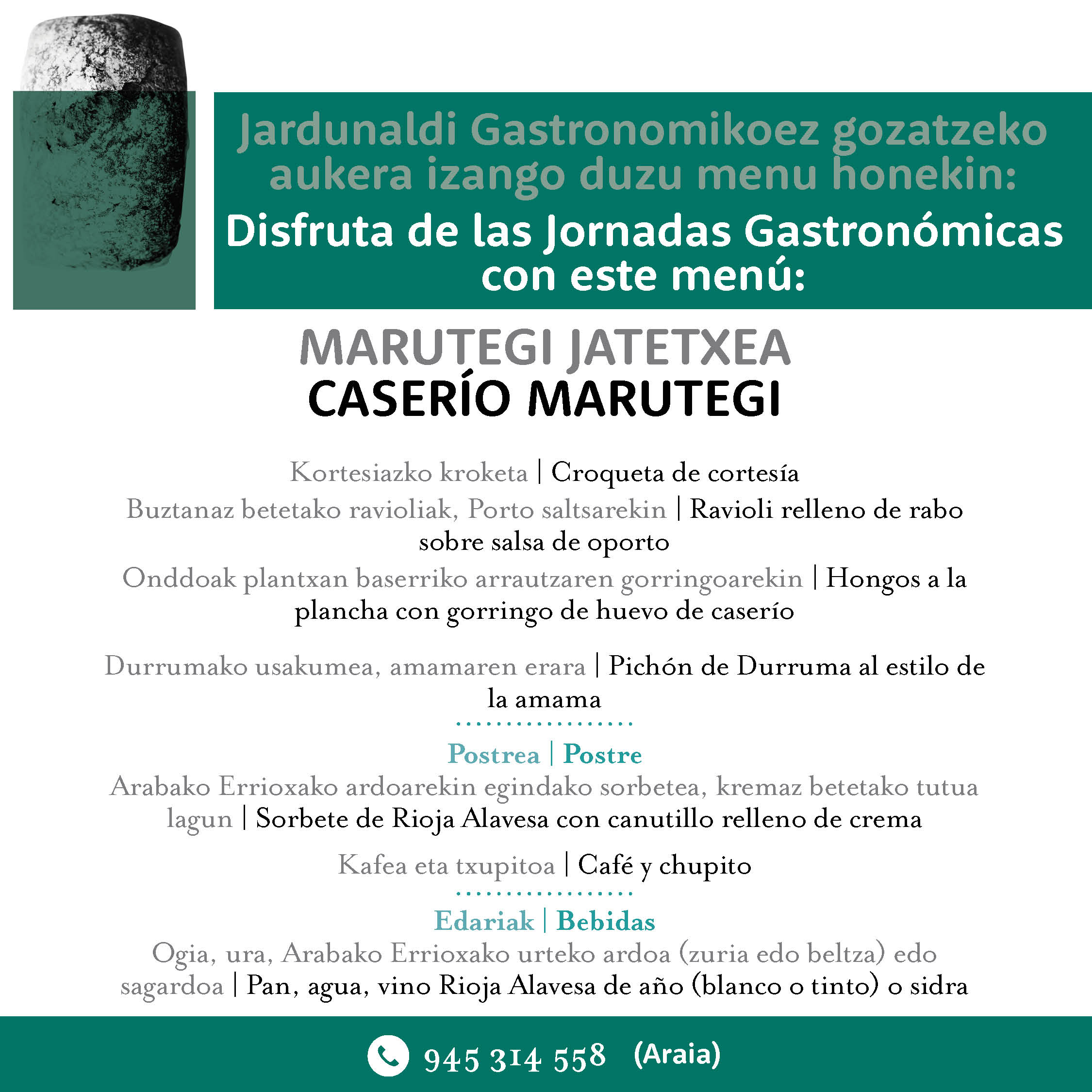 Araiako Marutegi Jatetxeak ere parte hartuko du jardunaldietan, menu gastronomikoaren modalitatean. Azaroaren 3tik 16ra, egun hauetarako bereziki diseinatutako menua eskainiko du, proposamen enogastronomikoa zabalduz